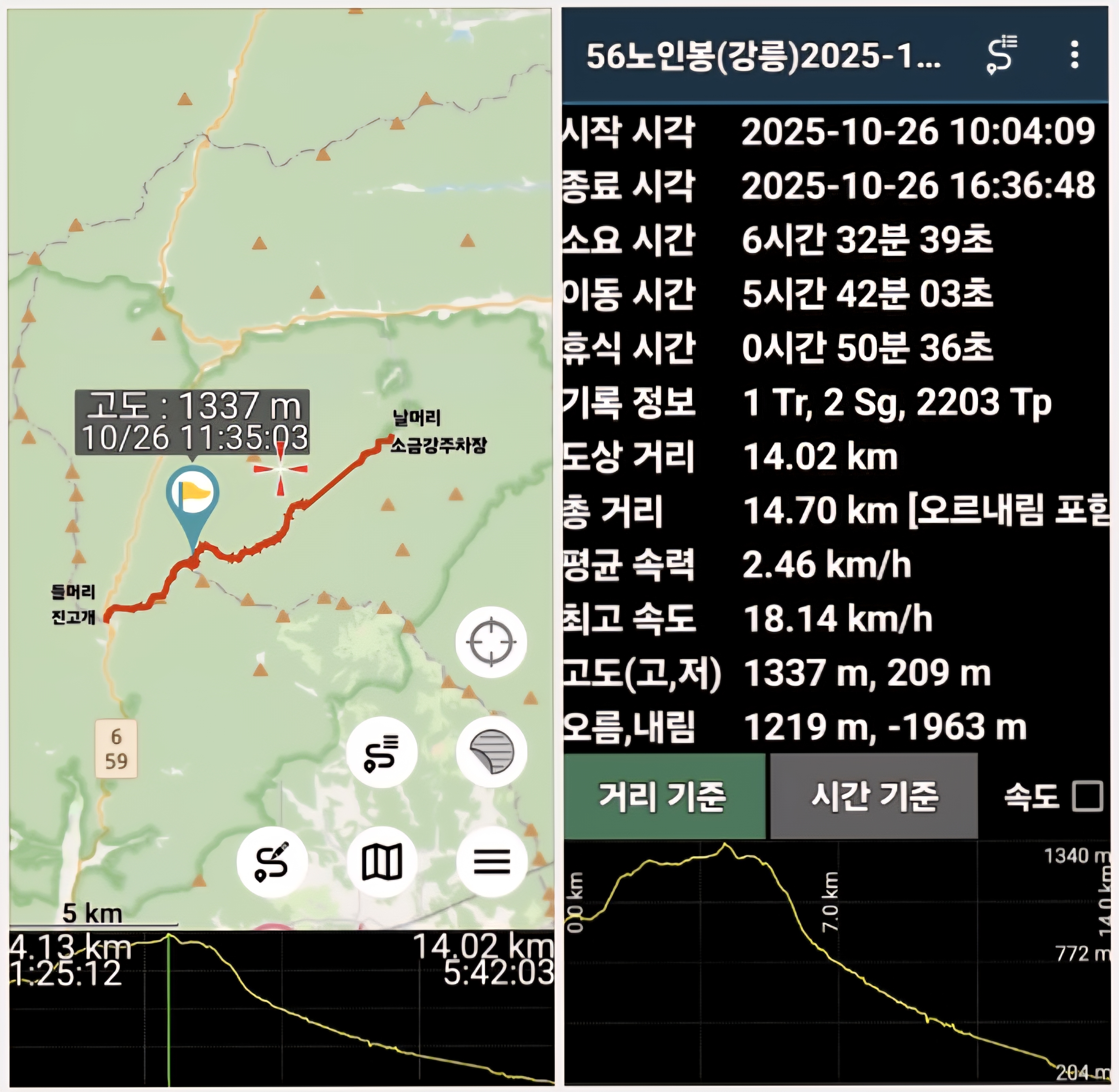 2025.10.26 (10:05)진고개 휴게소ㅡ노인봉(11:30~12:20)ㅡ소금강주차장(16:35)